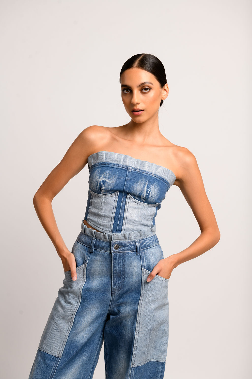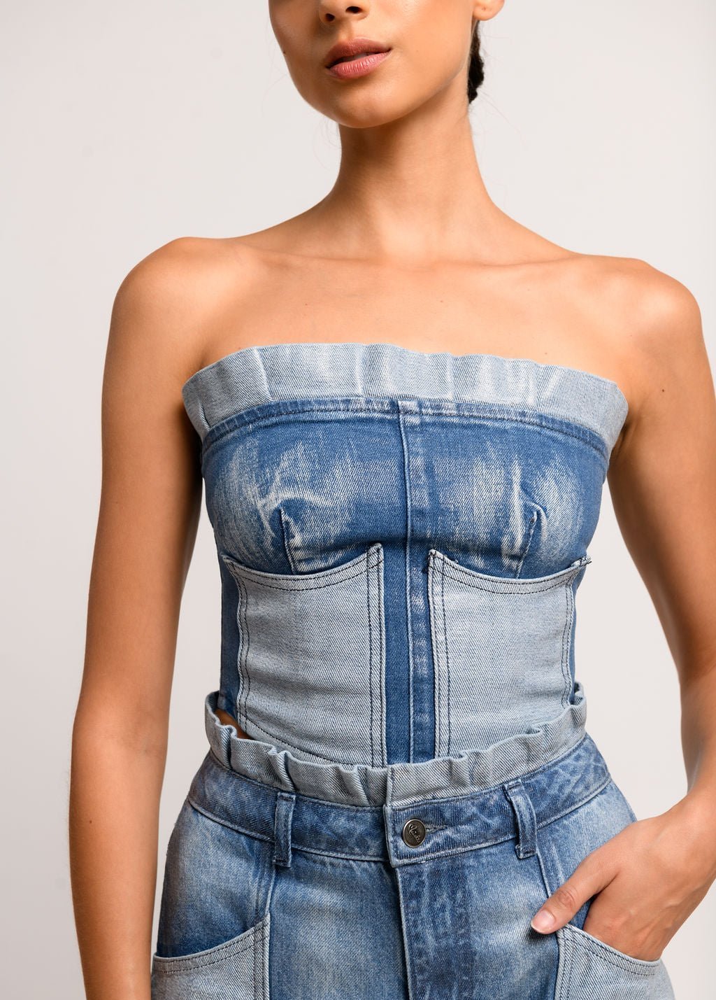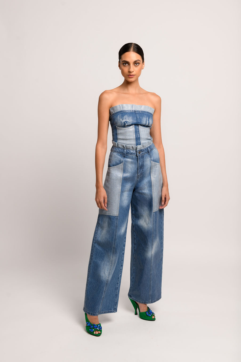 Medium-wash indigo stretch denim with brushstroke bleaching and a waxed coating. Patch pockets at bust. Cropped fit, zipper closure at center back. No two garments are the same as the bleaching is hand-applied.