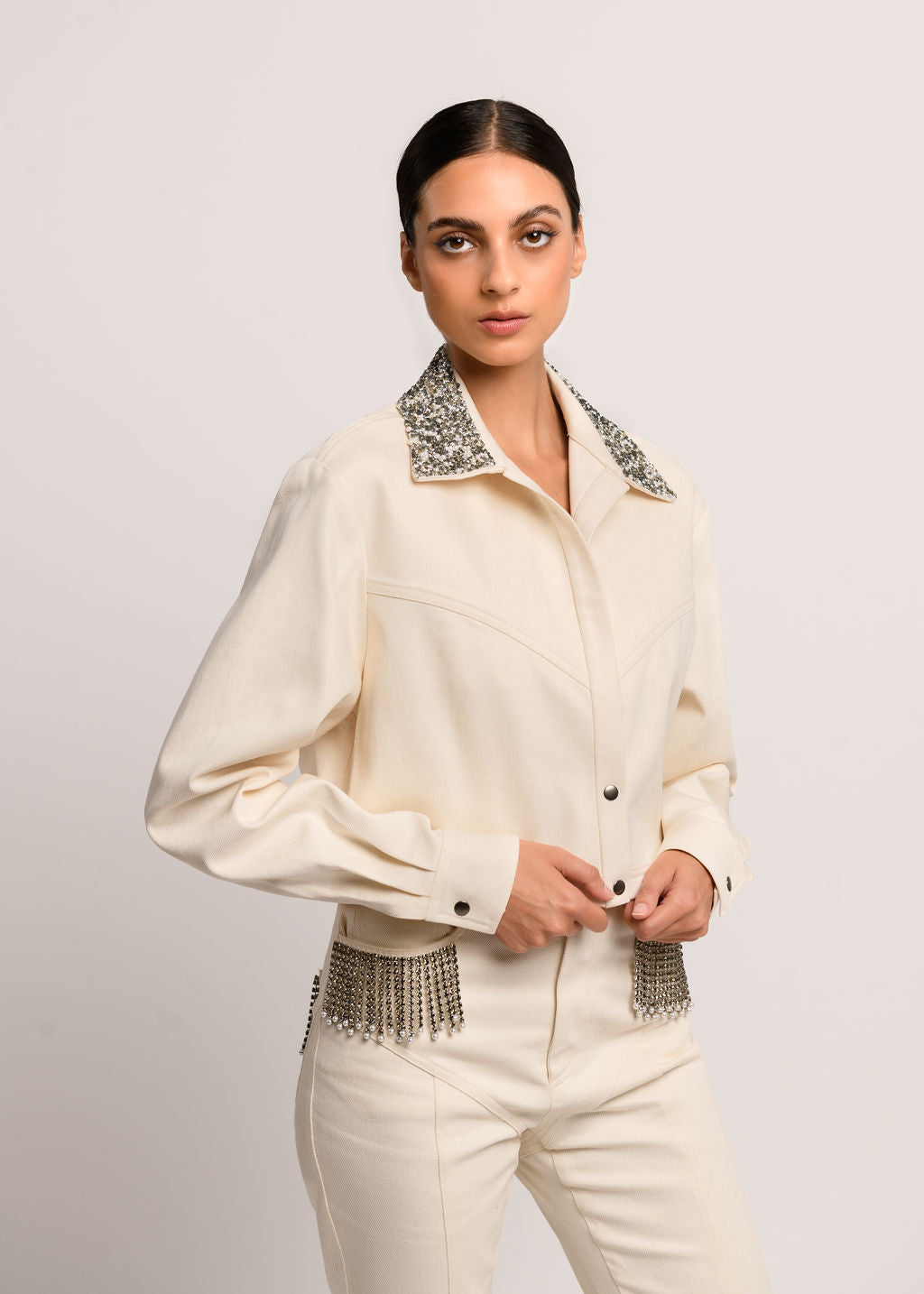 Ivory denim jacket with structured crystal & pearl encrusted collar. Fitted cuffs. Cropped fit.